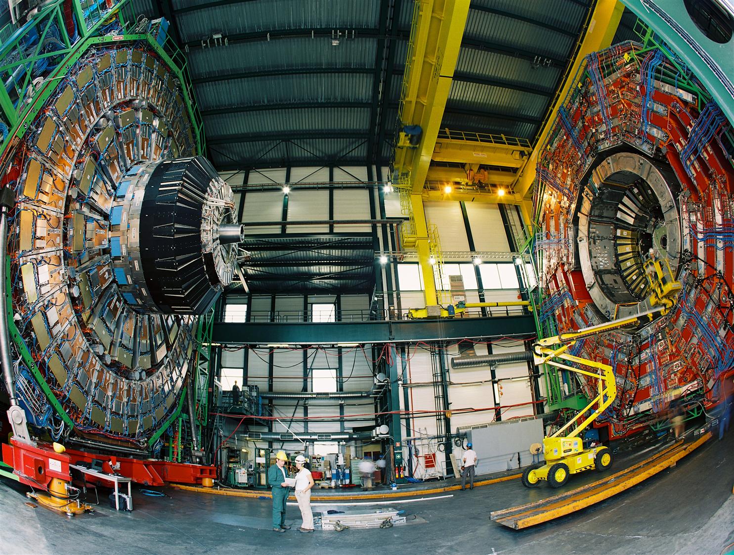 Der CMS-Detektor wurde an der Oberfläche zusammengebaut und dann in Scheiben in die unterirdische Kaverne herabgelassen, wo die Scheiben wieder zusammengebaut wurden.