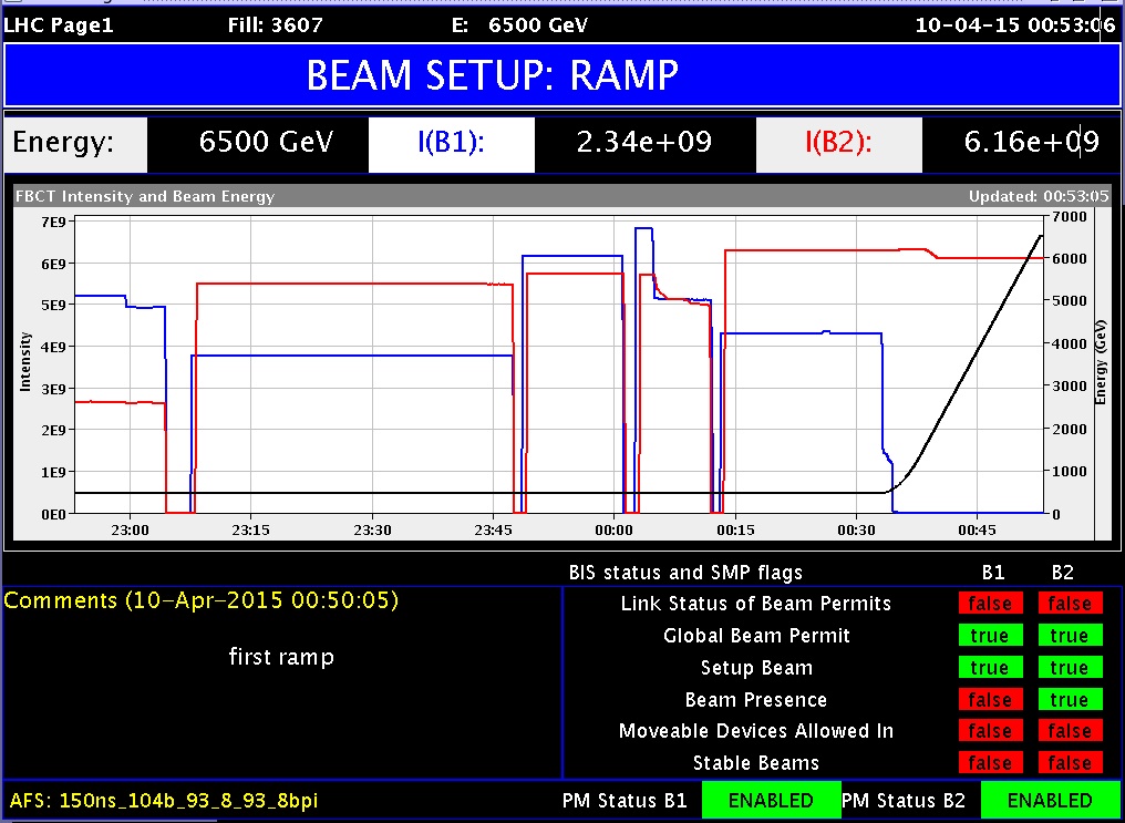 Erster Rekord nach dem Neustart des Large Hadron Collider: am Morgen des 10. April kreiste der erste Teilchenstrahl mit der Rekordenergie von 6,5 TeV im Teilchenbeschleuniger.