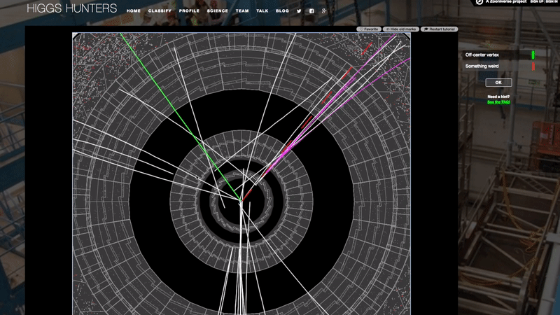 Im „Higgs Hunters“-Projekt besteht die Aufgabe also darin, auf Event Displays, die vorher nach bestimmten Kriterien durch die Forscher ausgewählt wurden, OCVs zu markieren und anzugeben, wie viele verschiedene Teilchenbahnen aus diesen Punkten hervorgehen. Zusätzlich sollen die Teilnehmer alles markieren, was ihnen komisch vorkommt. Es gibt Foren, in denen besonders spannende Bilder diskutiert werden und die Hilfe bieten, wenn Teilnehmer sich bei der Auswertung unsicher sind. In einem Blog erklären Wissenschaftler die Grundlagen der Teilchenphysik und geben aktuelle Informationen zum Verlauf des Projekts.